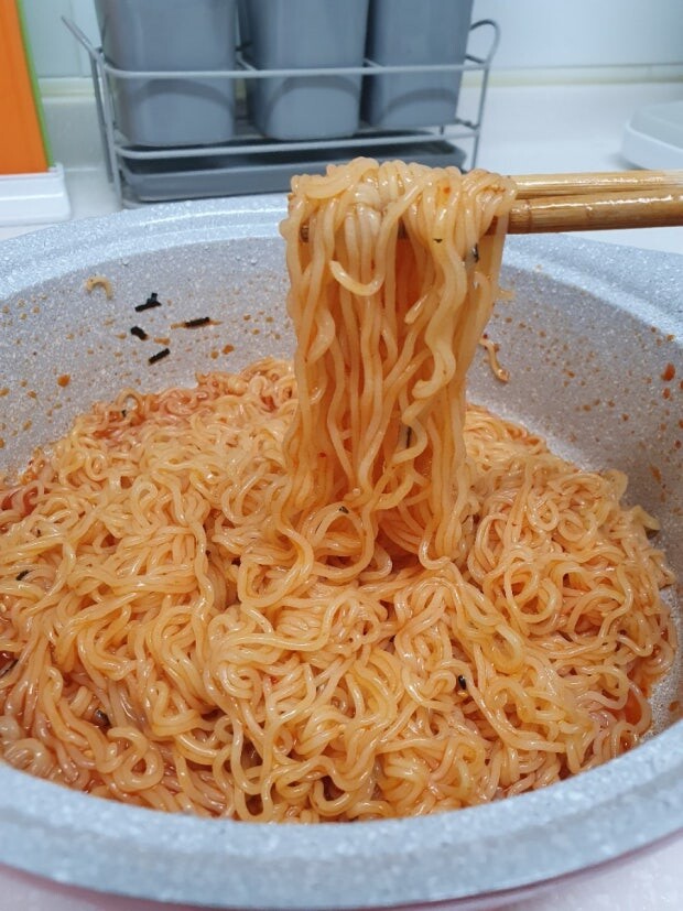 If you like spicy and cold noodles, this is for you. It comes from Bibim Guksu, which is basically thin wheat noodles with a spicy sauce. People love this in summer or late at night. There are a few brands, but Paldo Bibimmyun is what everyone thinks of when you say “Bibim Ramen.”