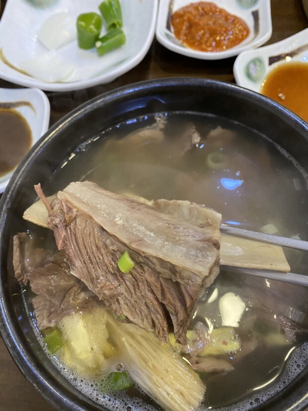 This soup is built around thick, meaty beef ribs. The broth is a little cleaner and lighter than seolleongtang, but the meat is rich and juicy. Many people eat it with wasabi soy sauce on the side — it balances the fattiness perfectly. If you love big bites of beef, this one’s for you.