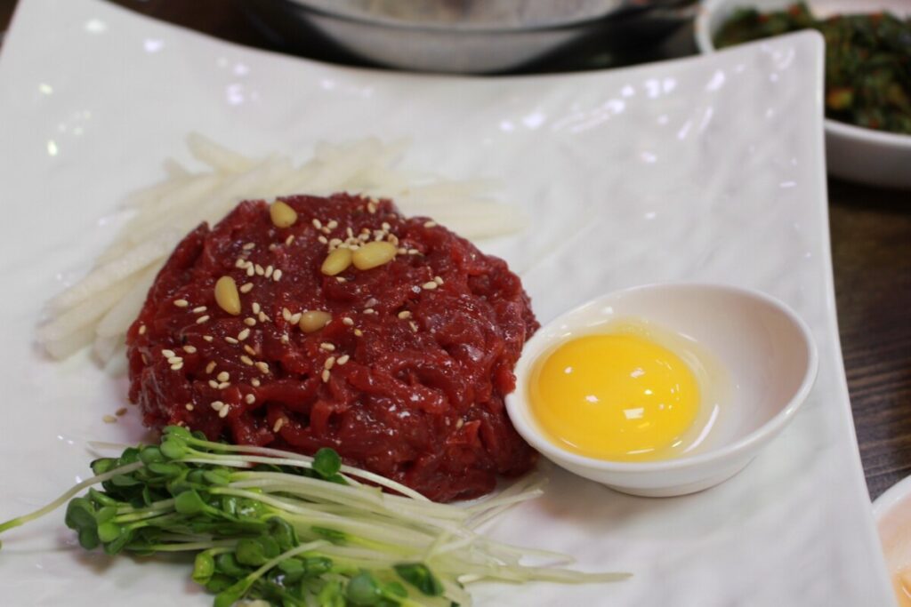 Initially, you may not want to try raw beef, but the taste is truly amazing! You may worry about the safety of consuming raw beef, however it helps to know that beef should be extremely fresh if restaurants want to sell it for raw consumption. Also, it is extremely rare in South Korea that people become ill due to eating fresh raw beef. There are two types of raw beef dishes in South Korea: yuk sashimi and yuk heo. Even though “heo” in Korean means “sashimi”, “yuk (beef) heo” and “yuk sashimi” are different; yuk heo is very thin raw beef marinated in sauce, and yuk sashimi is simple, thicker slices of raw beef, similar to fish sashimi. If you like sauce as an accompaniment to beef, I recommend trying yuk heo. But if you want to taste fresh beef itself, my recommendation is yuk sashimi. Normally people eat yuk sashimi with some sauce on the side, but this depends on the person and restaurant. You can get raw beef from good Korean BBQ restaurants or quality meat markets like Majangdong in Seoul. The city of Deagu is very famous for a type of yuk sashimi called muntigi, which is very thick raw beef with an amazing flavor